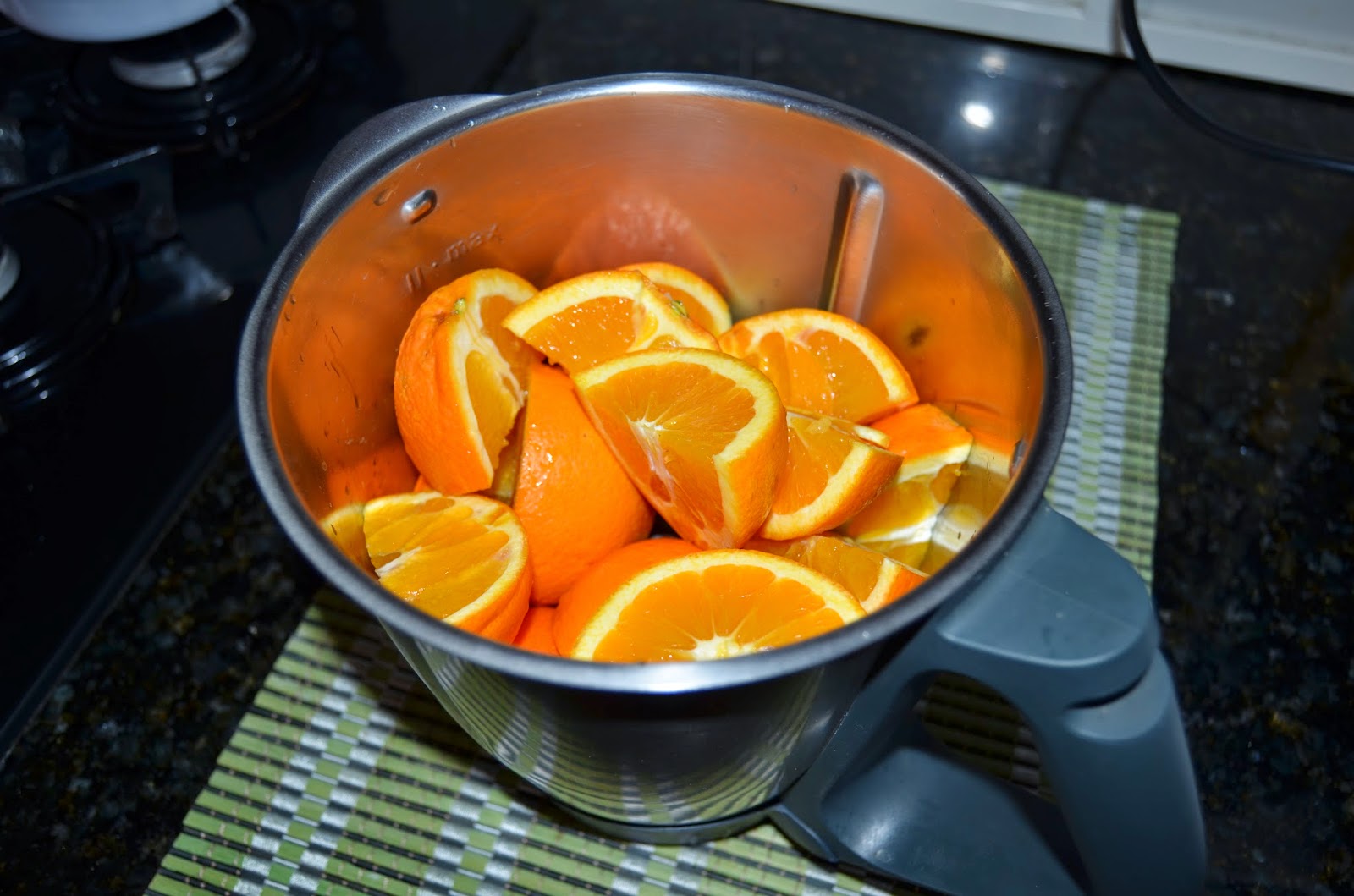 Este fi-lo na Bimby, porque coloco a laranja completa, aproveitando todo o suco que a laranja tem, incluindo o da casca. Depois de lavadas, corto as laranjas em quartos, ponho no copo da Bimby, junto alguma água e cerca de 100 gr de açúcar. Ligo o turbo durante 1 mn. Depois sirvo-me do cesto para coar o sumo.